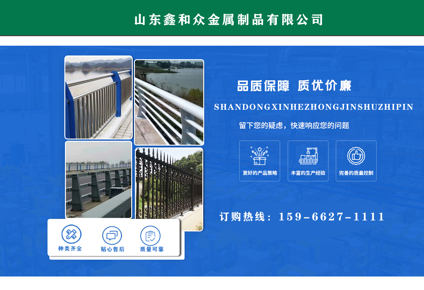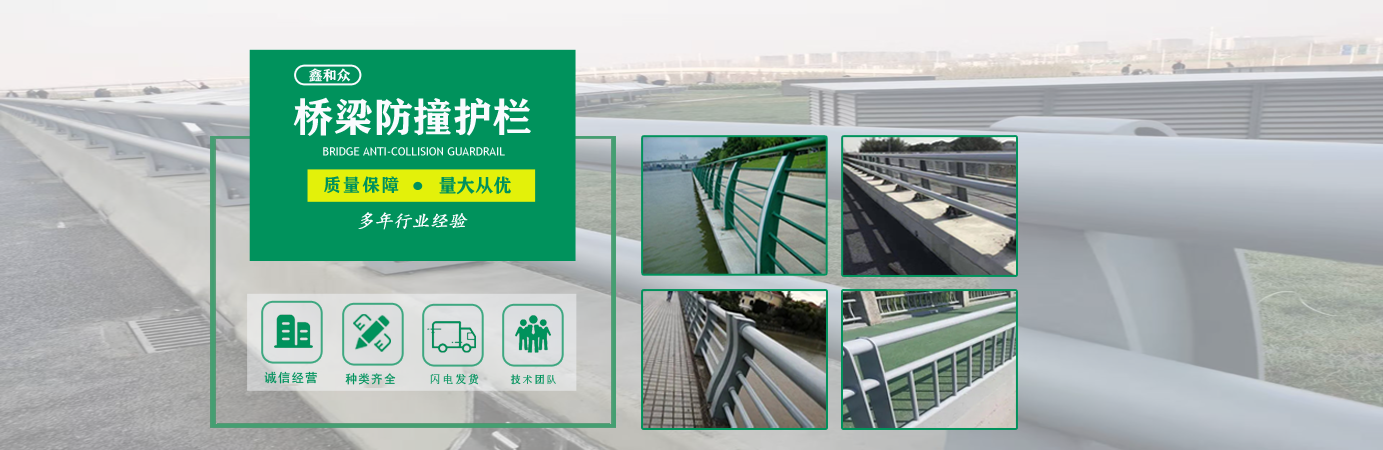 山東鑫和眾金屬制品有限公司主要產(chǎn)品有防撞護(hù)欄,橋梁護(hù)欄,道路護(hù)欄,河道護(hù)欄,不銹鋼護(hù)欄等護(hù)欄。提供設(shè)計(jì)方案,一站式定制,包您滿意價(jià)格優(yōu)惠,歡迎來電咨詢!    公司常年從事銷售護(hù)欄防撞護(hù)欄,橋梁護(hù)欄,道路護(hù)欄,河道護(hù)欄,不銹鋼護(hù)欄,橋梁鋼護(hù)欄,河道燈光護(hù)欄等。產(chǎn)品廣泛應(yīng)用于橋梁、河道、旅游景區(qū)、道路、公路、公園、小區(qū)、景觀、道路防撞等領(lǐng)域。    公司產(chǎn)品均采用優(yōu)質(zhì)不銹鋼材料,符合相關(guān)標(biāo)準(zhǔn)。各種型號不銹鋼復(fù)合管及護(hù)欄,質(zhì)量嚴(yán)格把控。產(chǎn)品強(qiáng)度高、耐腐蝕、焊接牢固、抗沖擊、性能好,防撞護(hù)欄結(jié)構(gòu)簡單、美觀實(shí)用大方。     歡迎前來訂購!...